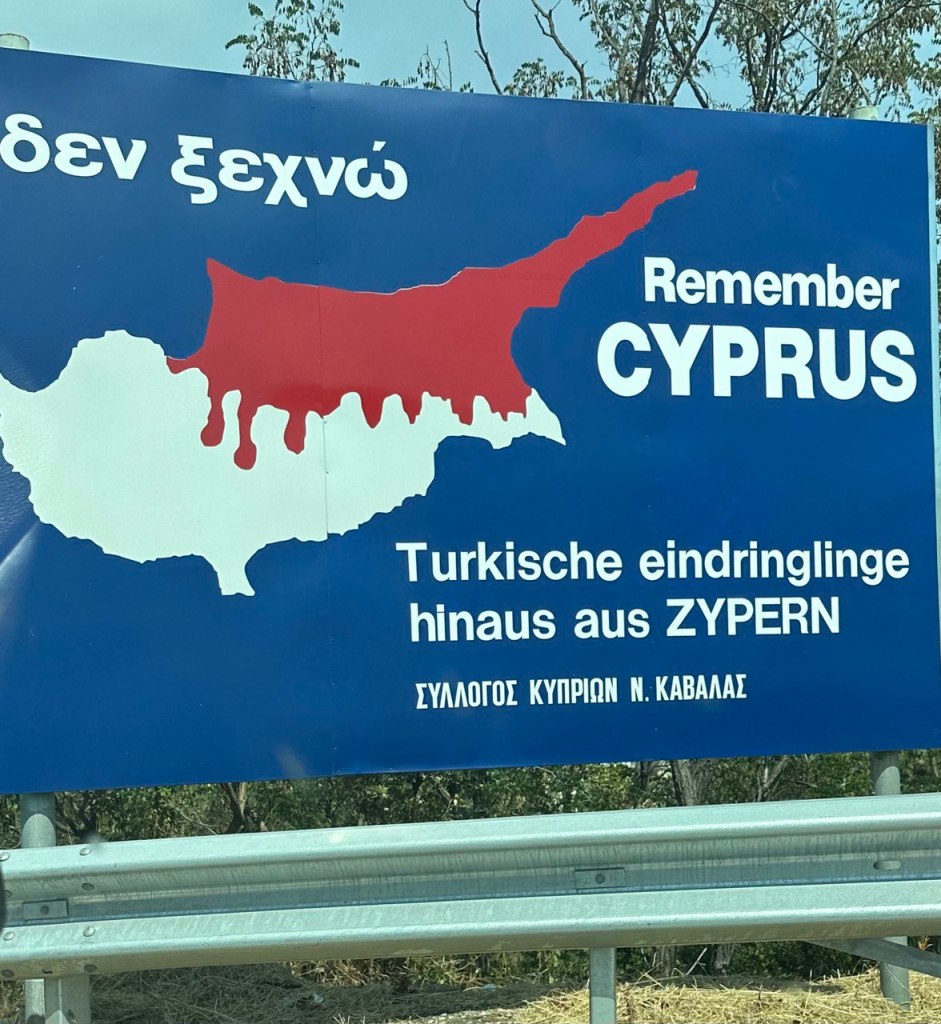 Bir diğer garip tabela ise Kuzey Kıbrıs Türk Cumhuriyeti’ni kanlı olarak gösteren tabela. Bu tabelanın Kavala şehrinin giriş çıkışına koyulma amacı ise biraz daha farklı. Eskiden Avrupa’ya gidip gelen gurbetçiler Yunanistan üzerinden Türkiye’ye giriş yapmak istediklerinde henüz otoyol yapılmadığı için Kavala şehrinin içinden geçmek durumunda kalıyormuş. Yunan makamları da bu fırsatı bulunca kullanmak istemiş ve kendi propagandalarını yapmak için şehre Kıbrıs Barış Harekatı’nın kanlı bir operasyon olduğunu ima eden Almanca tabelalar koymuş. Biz yine bu noktada bilgiyi verip susalım, yorumu sizlere bırakalım…